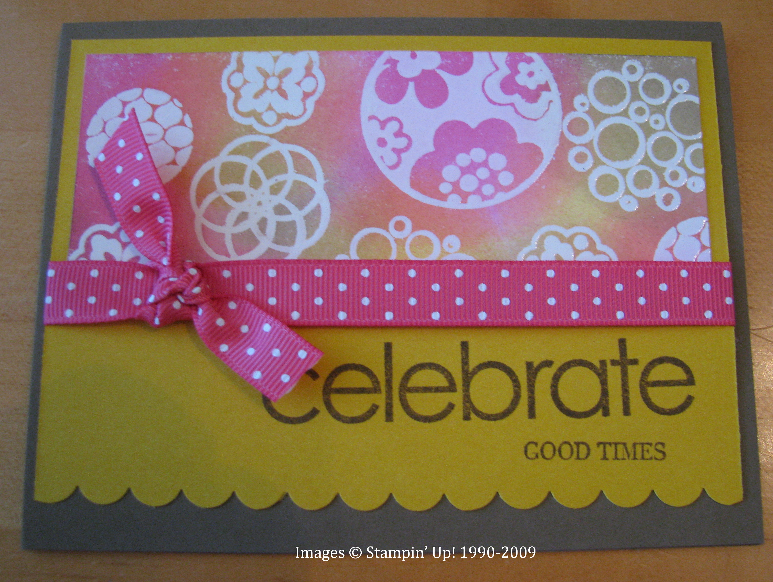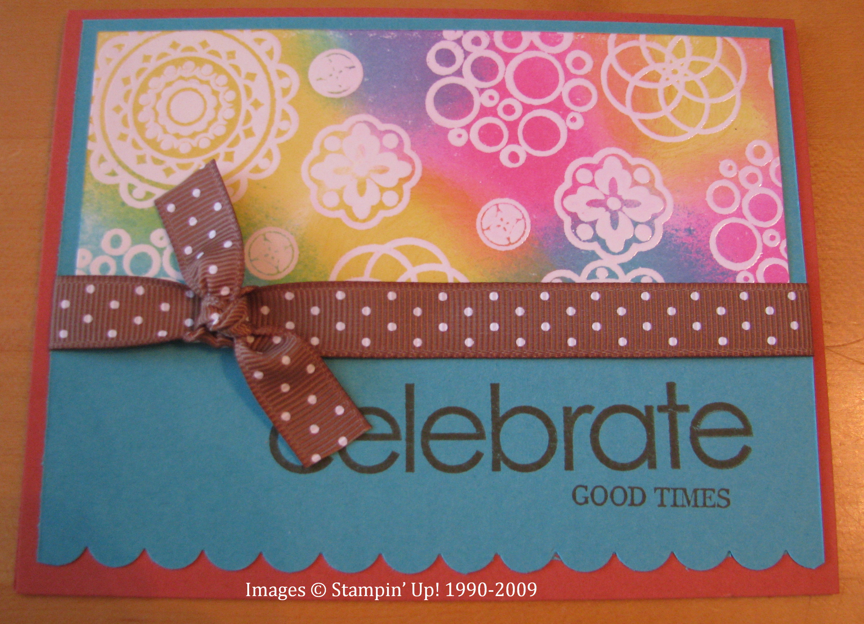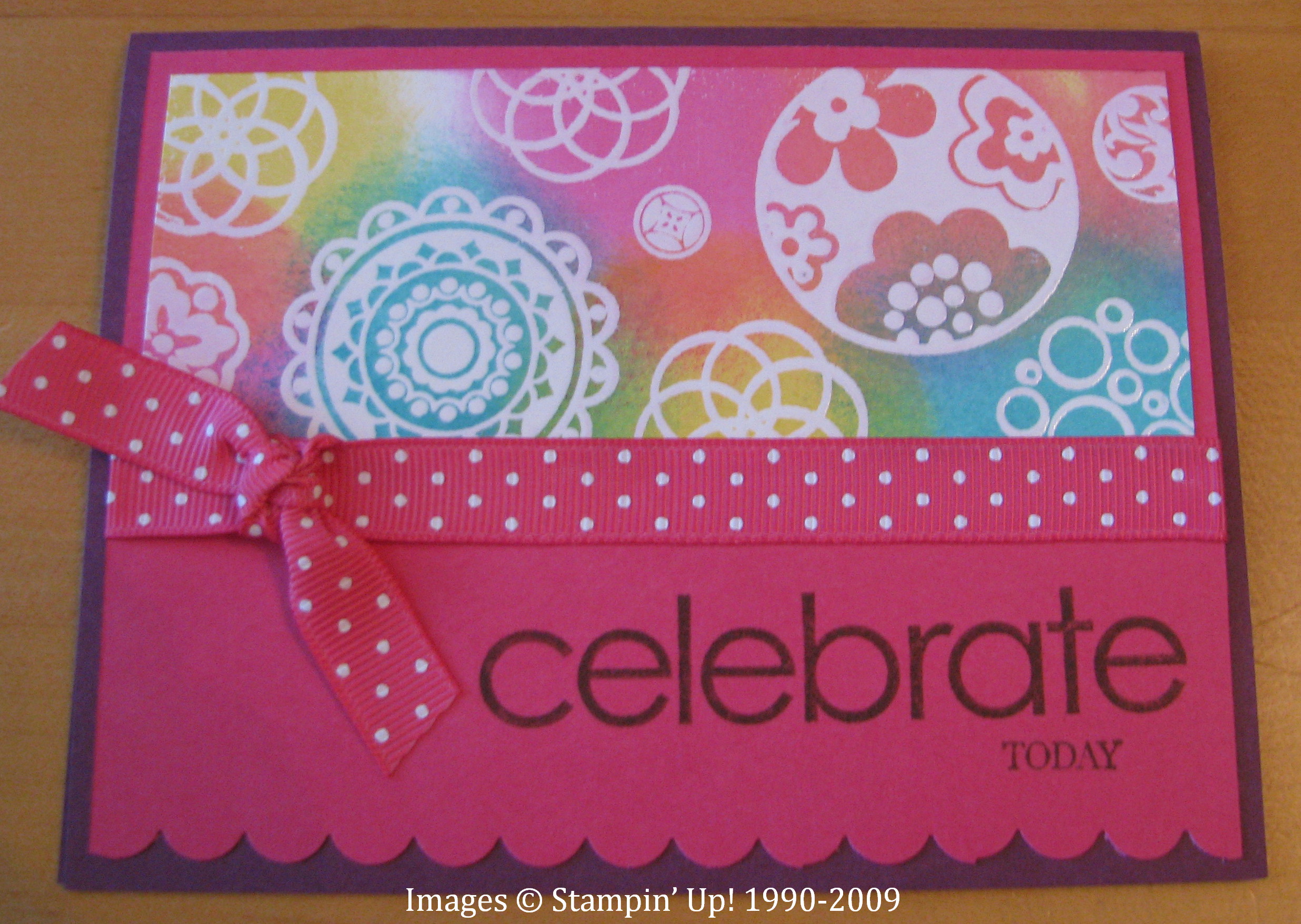 I made several cards using various combinations of the new In Colors. The technique I used is called Emboss Resist….I stamped the circles with Versamark and embossed with Clear Embossing Powder. Then I sponged on various In Color inks over the embossing and then wiped off with a tissue. Very simple and fun! The polka dot ribbon is also new! Isn't it pretty?!