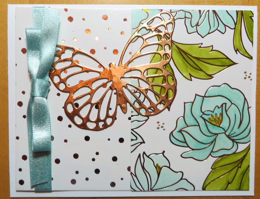 The butterfly is cut with a die we’ve had for awhile, the Butterflies Thinlits Dies. Some dies are just classic and can be used for a lot of things. This is one of them. I cut the butterfly out of the Copper Foil Sheet. All of our foil paper is so gorgeous!