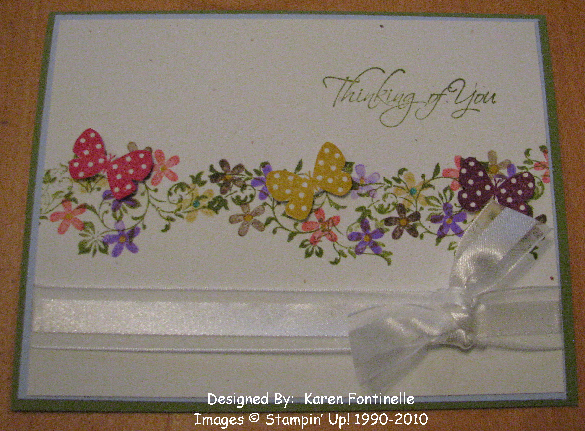 Get out that fantastic new set in the Occasions Mini, Vintage Vogue, and stamp a few green vines and leaves going across the paper. Then I went back over with a little flower from Flight of the Butterfly in the Idea Book & Catalog and stamped in various colors. I used the little butterfly stamp in that same set for the three little butterflies which are then cut out by hand and mounted on Dimensionals. Tie a pretty Whisper White Organza Ribbon around, stamp a sentiment, and you've got yourself a card!