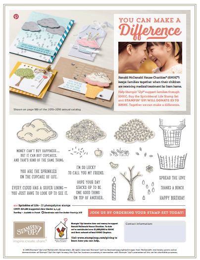 The Sprinkles of Life Stamp Set comes with a special bonus! While you are stamping beautiful cards and projects with it, you will know that you are contributing to the Ronald McDonald House Charities® by purchasing this stamp set. With every set sold, Stampin’ Up! donates $3 to this worthy charity, plus makes an annual contribution.