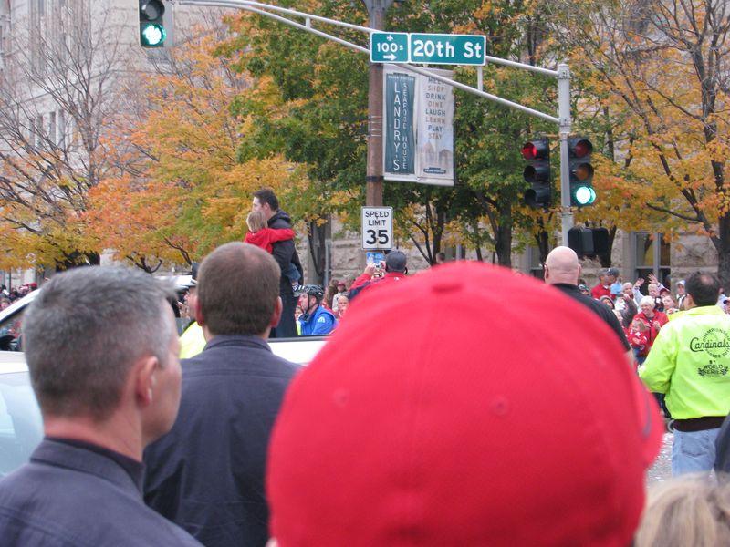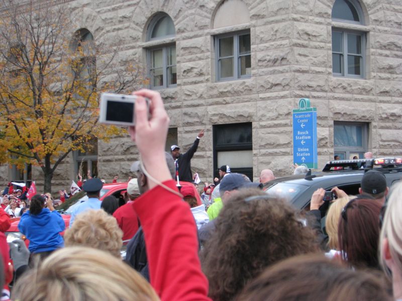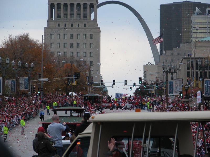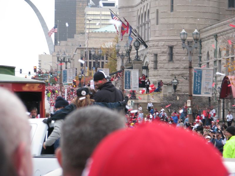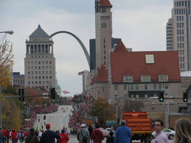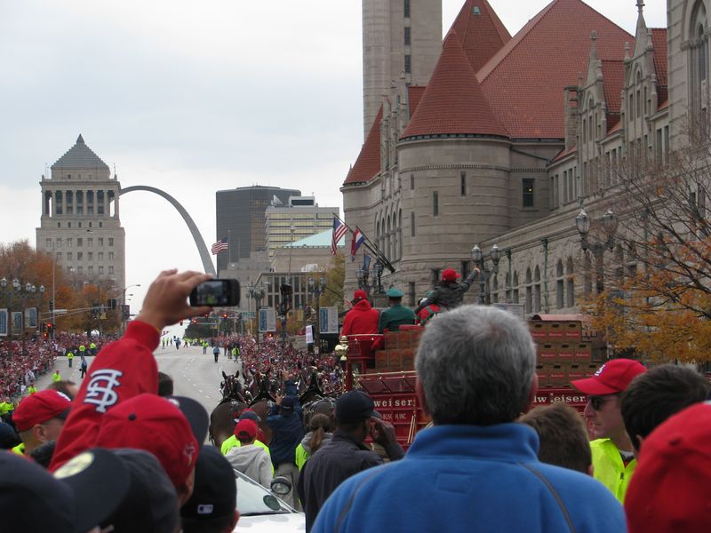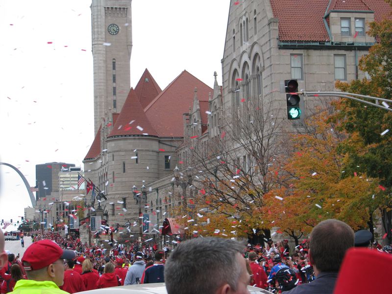 Walking to the parade. You can see the crowds of Cardinal red along the curb up ahead. That's the old Union Station on the right with the red roof and of course the St. Louis Arch up ahead. You can just about see the Old Courthouse at the base of the arch by the flag.