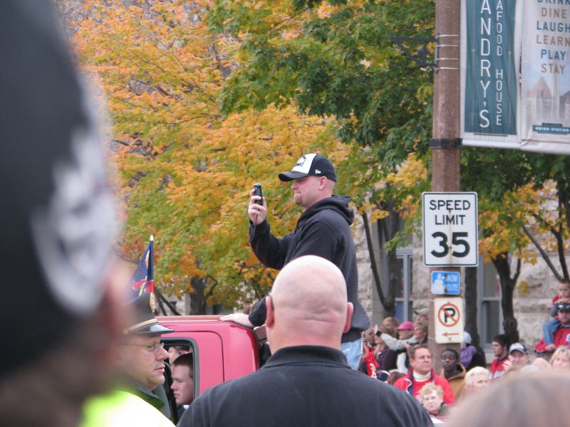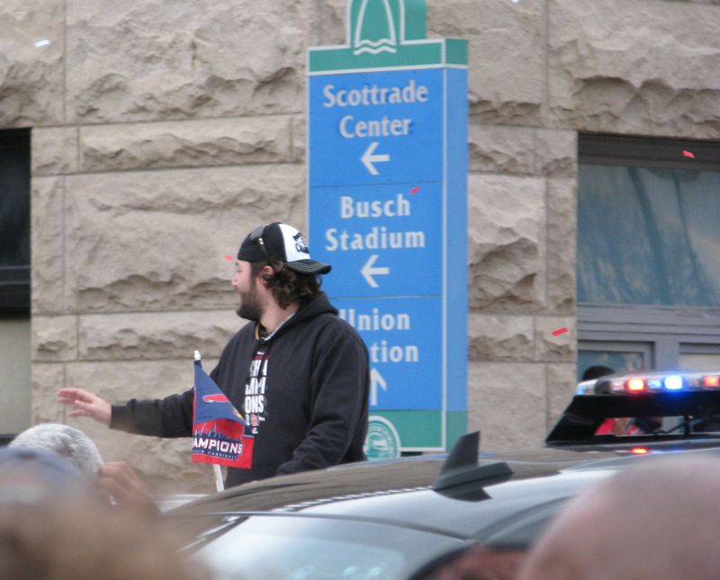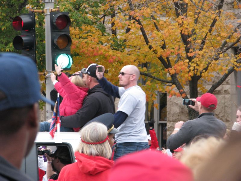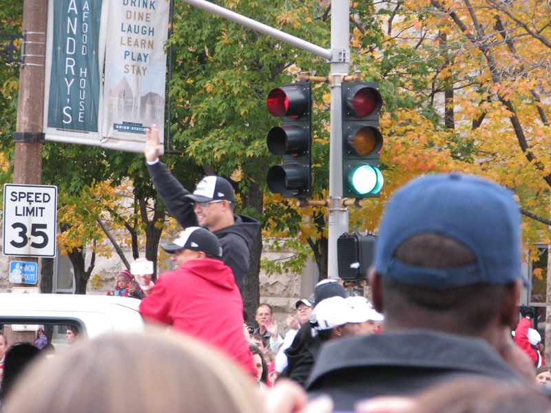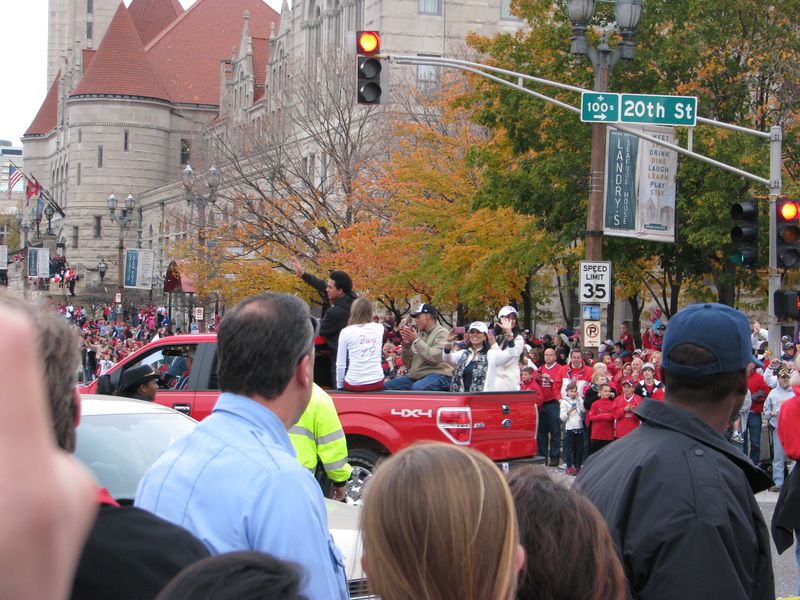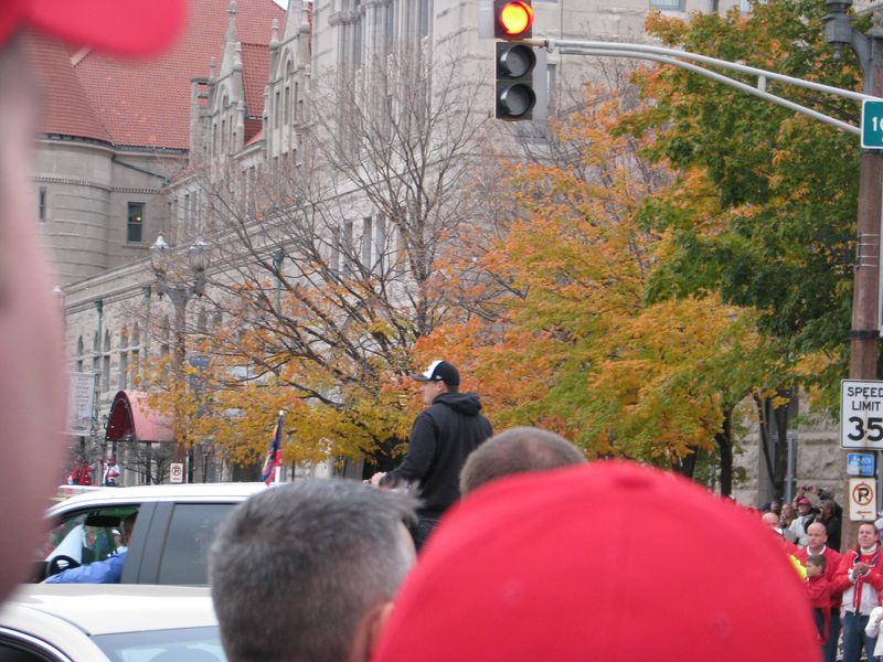 Walking to the parade. You can see the crowds of Cardinal red along the curb up ahead. That's the old Union Station on the right with the red roof and of course the St. Louis Arch up ahead. You can just about see the Old Courthouse at the base of the arch by the flag.