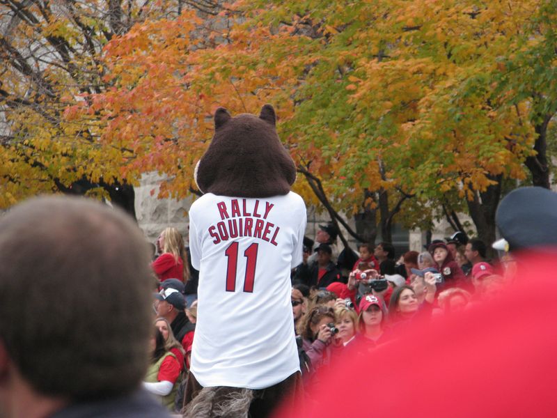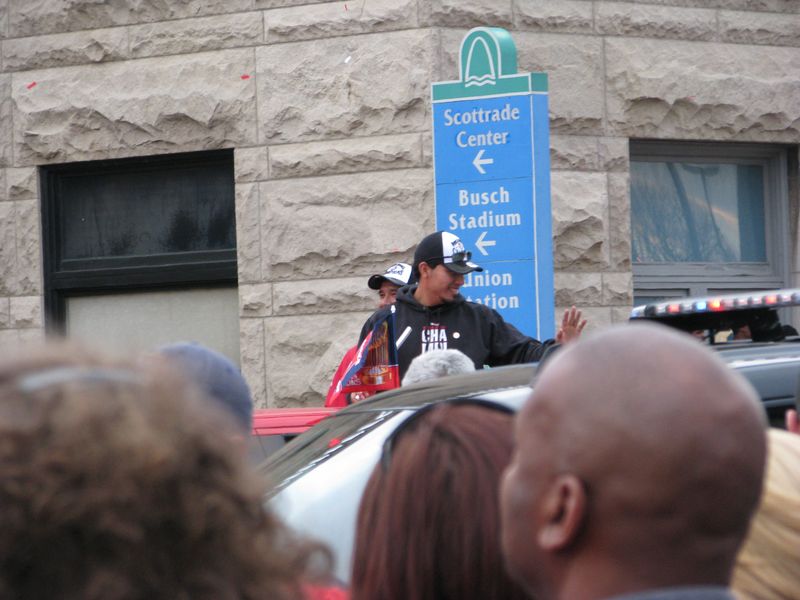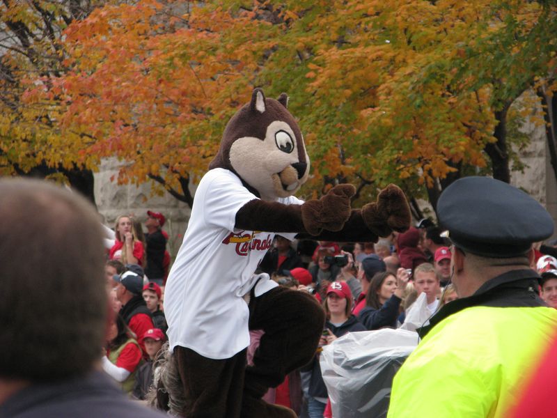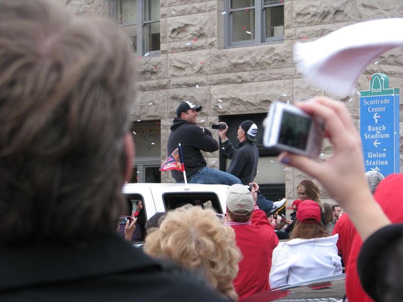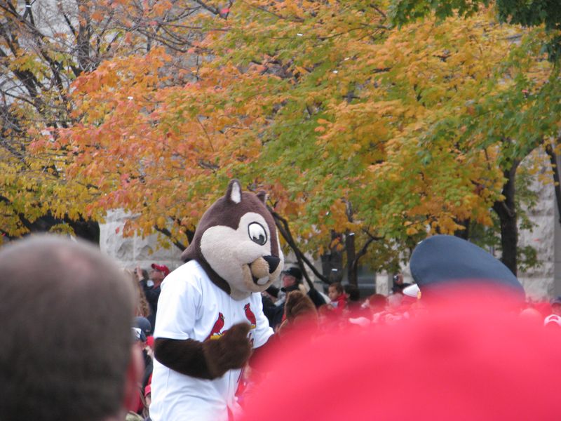 What a fun time to get to go with family to see the parade downtown for the St. Louis Cardinals, the new World Series Champions!! We got to our spot by Union Station just as the parade was starting. It was pretty hard to get good photos of the parade and players, but if you are a Cardinal fan, perhaps you will recognize some of them. At least I got a good picture of the Rally Squirrel! The Clydesdales led the parade with manager Tony LaRussa riding on the wagon. Don't think I got a picture of Lance Berkman but he rode by early on, a former Houston Astro. I even saved some of the red and white confetti for a souvenir!