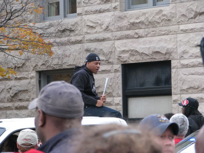 You can barely see the Clydesdale horses pulling this wagon. Manager Tony LaRussa is the one in the red jacket with his back to the camera on the wagon.