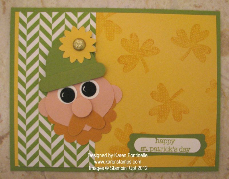 Happy St. Patrick's Day! Here's a little punch art leprechaun on a St. Patrick's Day card that you can make for fun! The leprechaun certainly wasn't my creation, but I saw it on display at Stampin' Up! Leadership and thought he was so cute! If you notice some new designer series paper on the card, it is from the new Summer Smooches, which is going to be a sneak peek of new products in the upcoming Stampin' Up! Catalog….and as demonstrators, we get to preorder certain new things! You will get that chance April 1st!