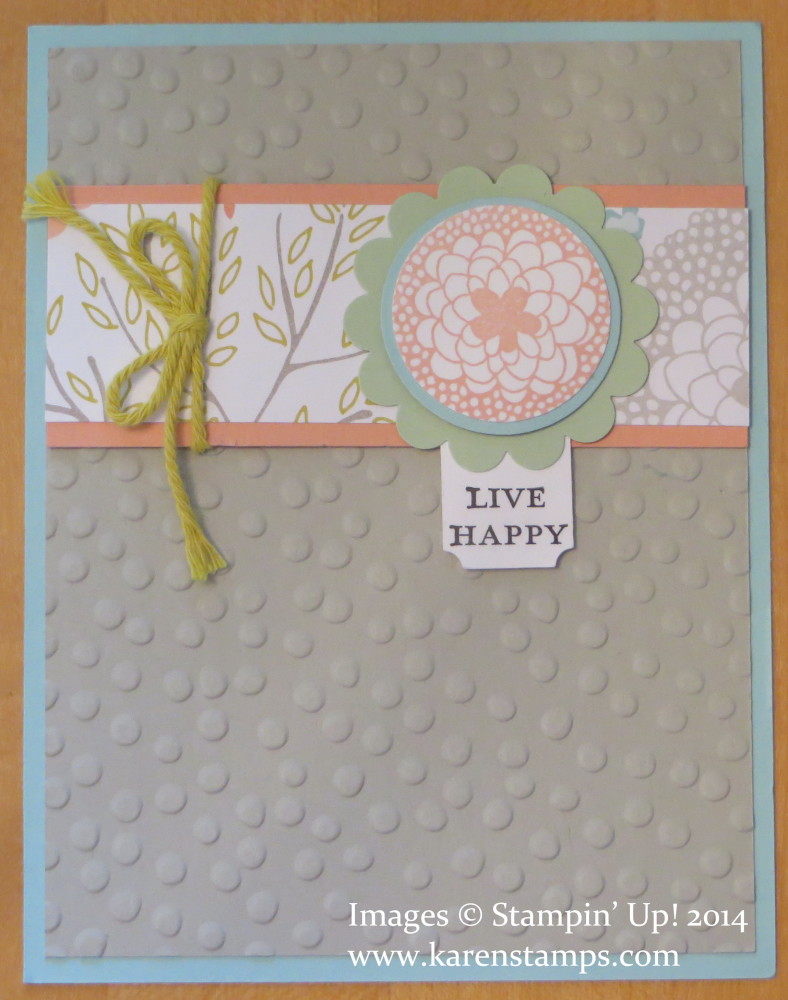 One of the products I LOVE in the Sale-A-Bration Catalog is this Decorative Dots Embossing Folder. I wasn’t that excited seeing it on the page, but once I started seeing it in person at Leadership I really loved the look! A nice simple card with the Sweet Sorbet paper and coordinating Petal Parade Stamp Set, plus some Twine from the Sweet Sorbet Accessory Pack.