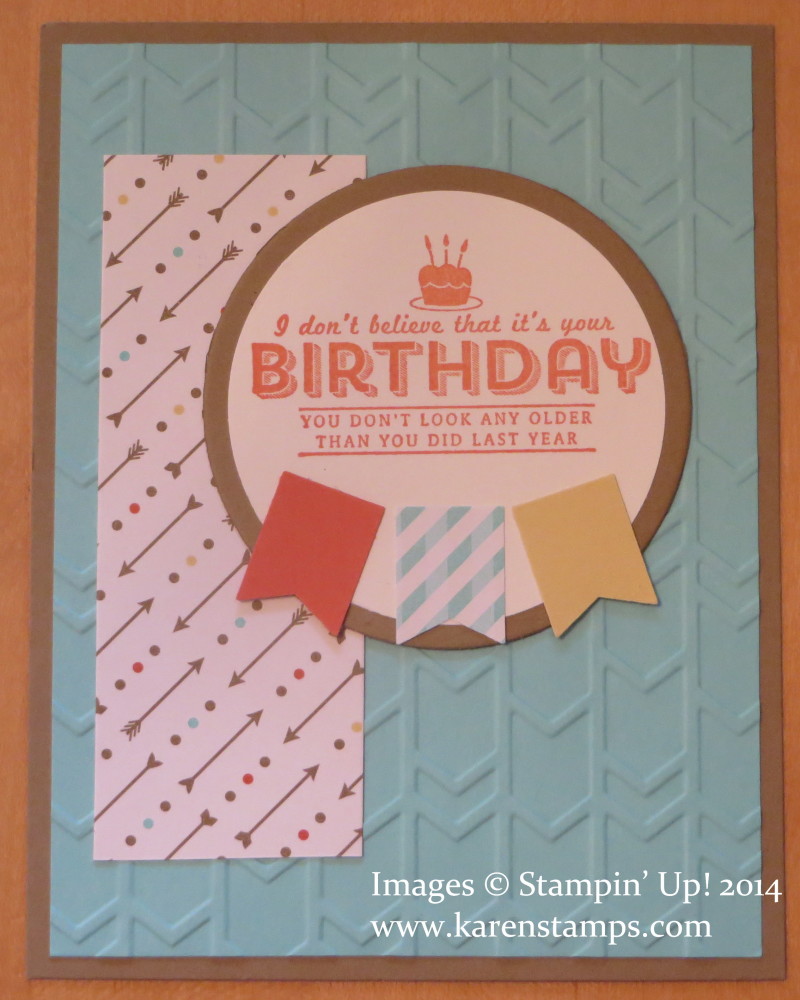 This card uses the See Ya Later stamp set, the new Banner Punch (which will be carried over to the new Annual Stampin’ Up! Catalog), and the Arrows Textured Impressions Embossing Folder in the Occasions Catalog.