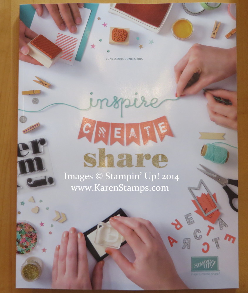 Here’s what we’ve all REALLY been waiting for! The brand-spanking new Stampin’ Up! Annual Catalog for 2014-15! If you look carefully at this cover, you will see some sneak peeks of what is inside and new! Shelli Gardner said she especially loved the photos of the hands, creating together, which shows one of the most important things about Stampin’ Up!, the relationships, the fun of stamping together.
