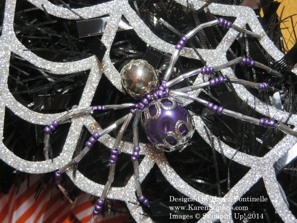The kit also contains all the beads and wires to make the spider for the wreath! I was anxious to make it, but when I started, I thought, “This is why I am a stamper and not a bead person!” But with the directions plus the video, plus a little patience on my part, it didn’t take long until I was moving along getting all those beads on the spider legs! I like the way my spider turned out. I just placed him on the wreath for the photo, not sure if I will glue him on or let him dangle!