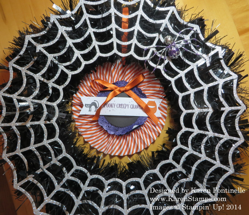 This weekend I finally got busy and made my Frightful Wreath Simply Created Kit for Halloween, since time is getting close! This is a great kit! It came together real easily as far as just the wreath and rosette are concerned! Complete directions are included with the kit, plus Stampin’ ! has a video. All you need is a hot glue gun. The Stampin’ Up! Silicone Craft Sheet is really handy to have when you are using a hot glue gun plus for making the rosette. The rosette piece comes already scored, all you have to do is accordian fold, adhere the ends, put a glob of hot glue on the silicone sheet and plunk the rosette down with the center in the hot glue to hold it. Then you get to ink up the doilies (I still have the black fingers and fingernails to show for it!) and finish off the front. I neglected to purchase the coordinating stamp set, Frightful Wreath Photopolymer Stamp Set, so I had to dig out a retired Halloween set for a greeting that worked, plus I added to stamped images from Freaky Friends on the ends just for fun!