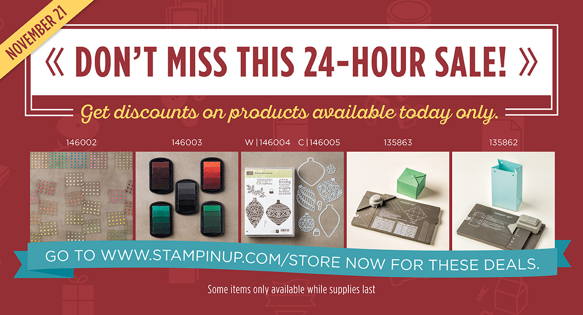 The Stampin’ Up! Online Extravaganza only happens once a year and today is the day! This sale runs November 21-28, but today only is this 24-hour sale! Don’t miss it!