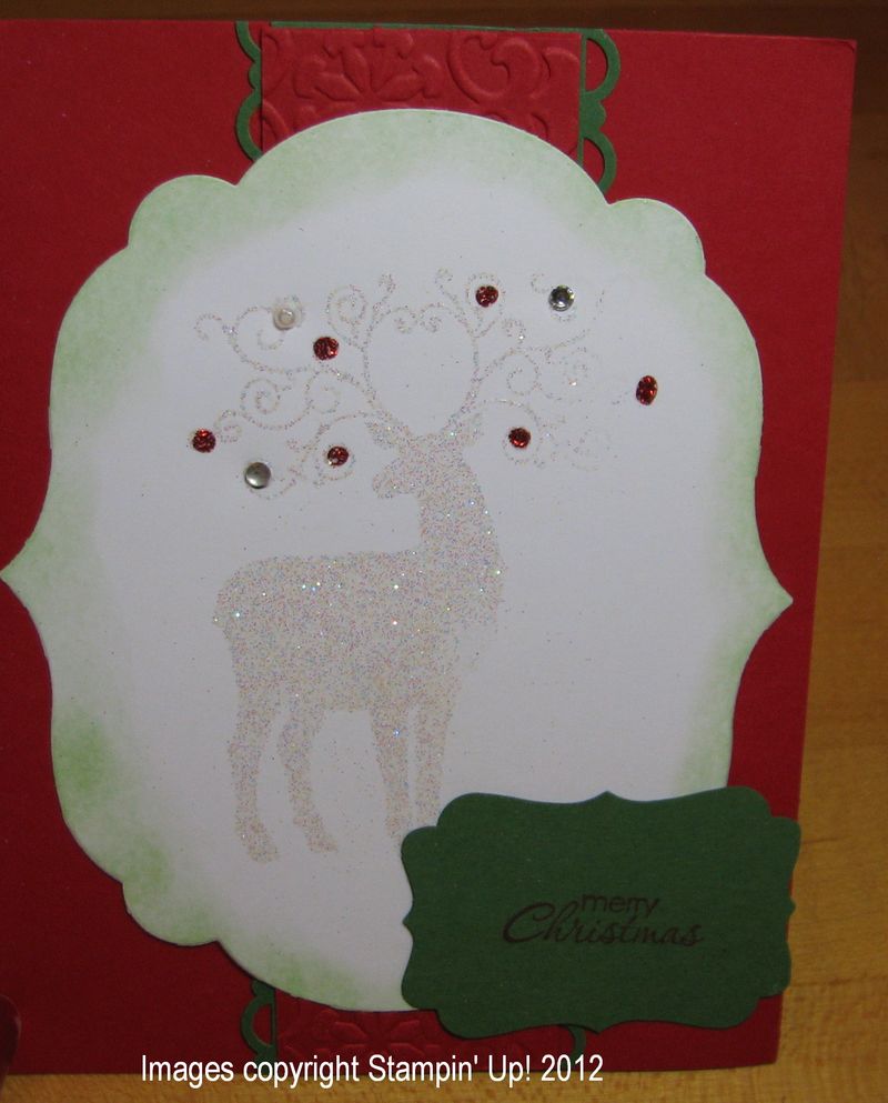 We received this card from my husband's cousin who I heard was making cards or maybe doing Stampin' Up! Well, as I was sorting through the mail that day, I could tell by touch that the envelope was Stampin' Up! Stampin' Up! has the nicest envelopes! They have a nice smoothness to them and you can stamp on them so well. Now I'm looking forward to hearing from this cousin again and hear how she got started stamping! (I had to hold the card up so I could get a good photo of the sparkly reindeer!)