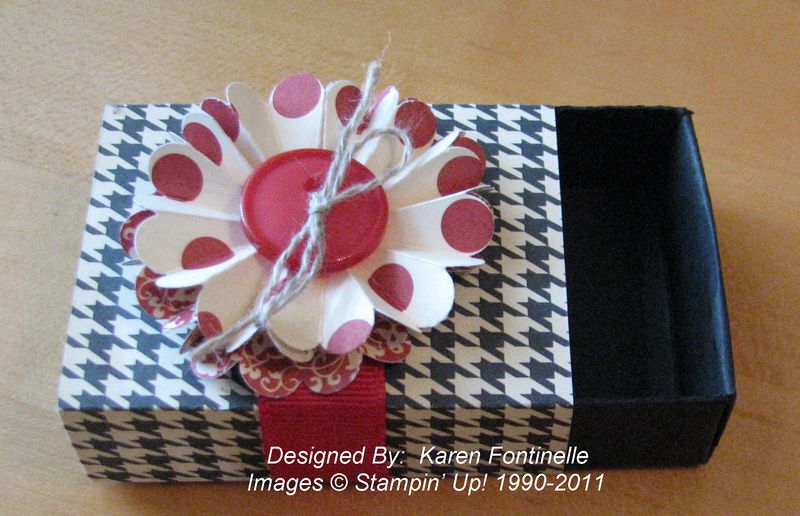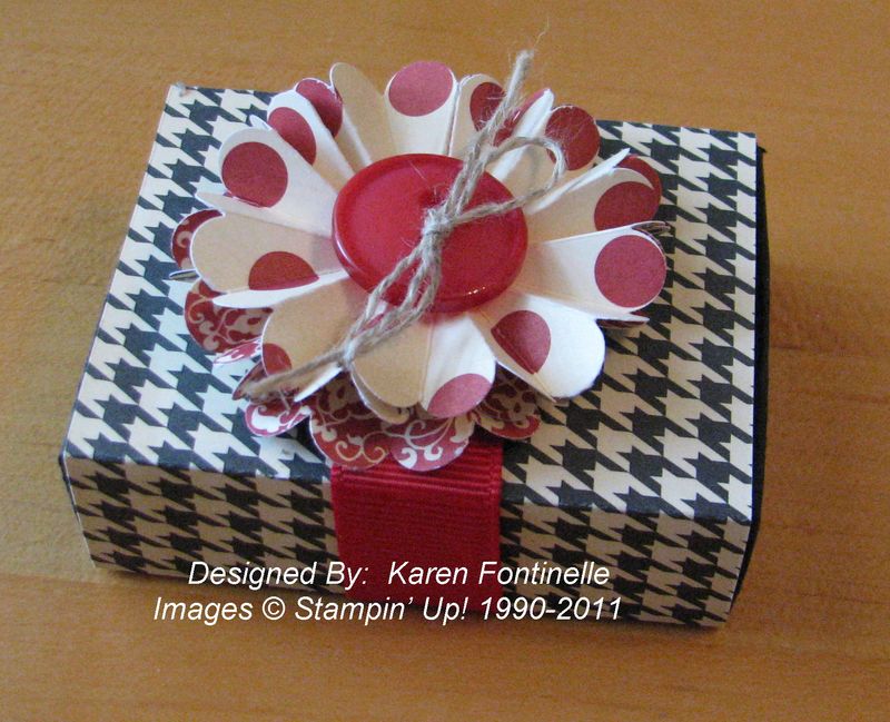 Use the Stampin' Up! Matchbox Die #114890 with your Big Shot #113439 to make this cute little box! The Love Letter Designer Series Paper #117162 with the black and white houndstooth pattern really makes this box up-to-date! Just the other day I read how trendy houndstooth is and that gave me the idea to make something with this paper. I LOVE the Real Red, Basic Black and Very Vanilla colors in this paper and have seen many cute projects using it.