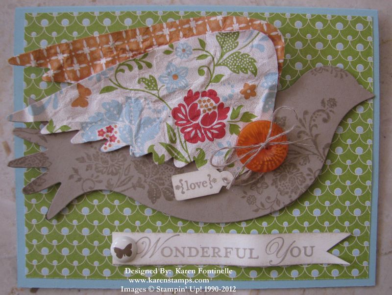 Here is a card I copied from Shelli Gardner, Founder and CEO of Stampin' Up!, on her blog. I love the Elegant Bird Die #125593, but I especially LOVE the Everyday Enchantment Designer Series Paper #126154 in the Sale-A-Bration Catalog. I'm sure lots of us wish they would carry that over into the new catalog! But Sale-A-Bration items are only available during Sale-A-Bration.