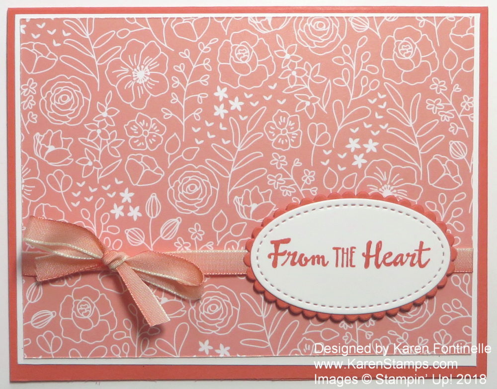 Well, when I flipped through the papers in the package, this side of the accented paper caught my eye! But why would I use THIS side and cover up the really gorgeous side? Because in that moment, I liked this side and wanted to make a card with it. So what’s a girl to do? Make a monochromatic card using this Calypso Coral colored paper, ink and ribbon! Yes, I did it! As you can see in the top picture, I adhered the ribbon to the back of the paper and put lots of Fast Fuse on that beautiful design so that I could use this Calypso Coral floral print side! Does it kill you to do that?? Yes, it’s difficult, but I think the other pretty papers deserve a chance to make a pretty card!