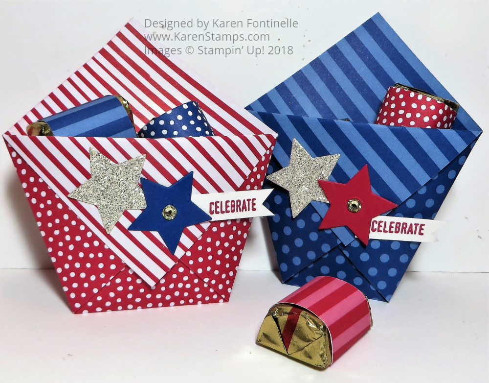 This July 4th Treat Pouch is a project from several years ago, but you could make it easily right away for a little treat for your 4th of July picnic, barbeque, or fireworks gathering. Use designer series paper which is a little easier to fold if you have some in appropriate colors. If not, you can use red, white, and blue cardstock! Or just use white if that’s what you have and do some patriotic stamping. Stars are ALWAYS good for an occasion like this so you can always add stars of any kind.