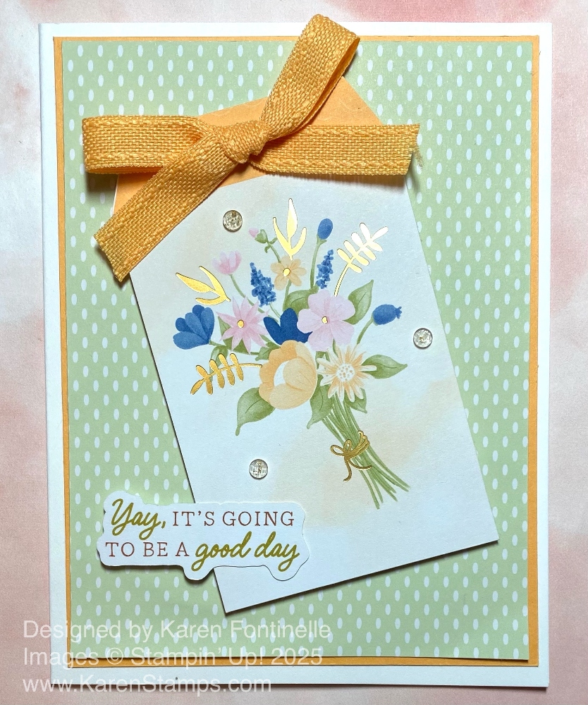 To assemble the card, layer the Bubble Bath cardstock diecut panel on the Timid Tiger panel. When you have the card folded into the Z-shape, adhere the designer paper on the narrow front panel and the other pattern inside the card. See where the center of that panel is so that it can be lined up right on the Z-fold. Only put glue or adhesive on the one side so that the other side will not be stuck to the inside of the card! I had a scrap of the striped paper, so I adhered that as a background for the words to the front panel. The flower is popped up on Stampin’ Dimensionals and the leaves are glued flat to the card.