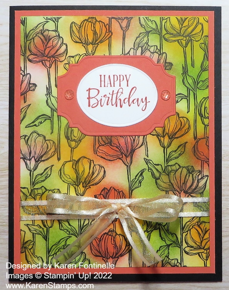 This is a slimline card made with a Basic Black cardstock card base. The card base is a 6″ square that is scored in half at 3″ so when it is folded, the card will be 3″ x 6″. The layer on the front of the card is Basic White cardstock 2 3/4″ x 5 3/4″.
