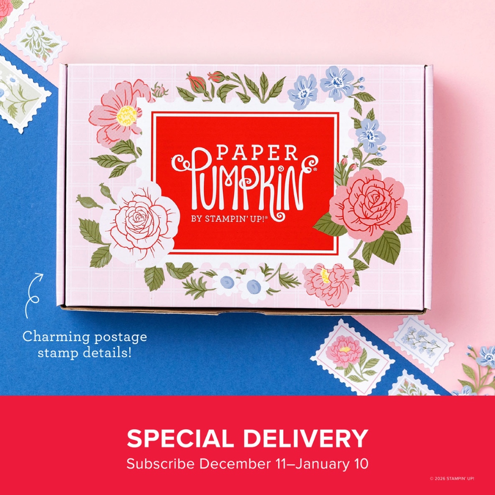 Here is the new Paper Pumpkin Kit for January 2026! It isn’t easy to think ahead to January and the New Year when we are so busy with holiday preparations, but I’m sure this Special Delivery Paper Pumpkin Kit will help us start the year off right! If you recently subscribed to Paper Pumpkin, your December Kit went out and you’ll receive it soon. Now that the December Kit went out after December 10th, it is time to think about the next kit! If you are not a subscriber yet, you can join any time through January 10th to receive this Special Delivery Kit! Personally, I don’t even have to see what is in the box, I want THE BOX! Look at how pretty it is! You can save and use this box for storage or gifts or anything after you make the kit. I love when they give us a specially designed box!