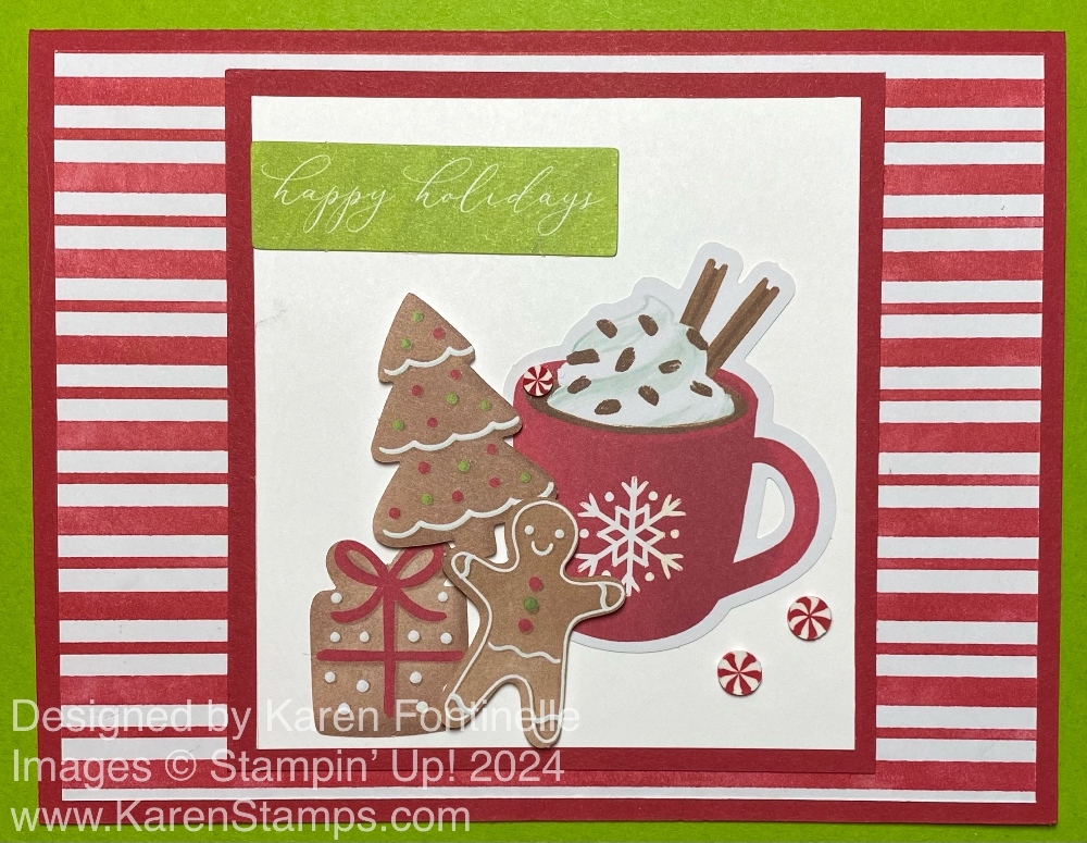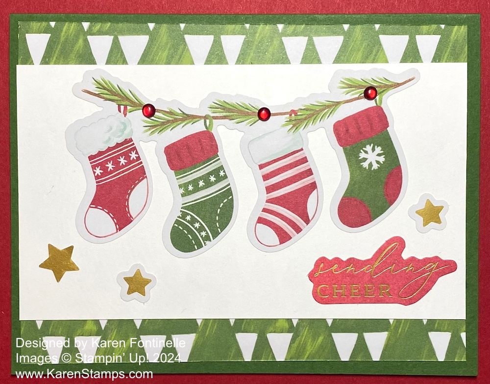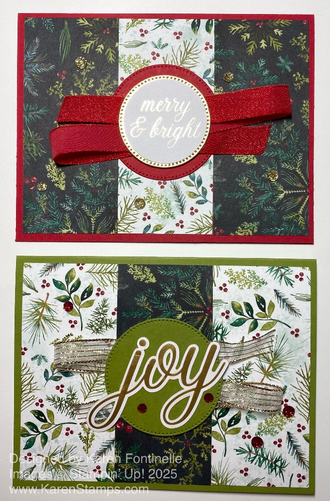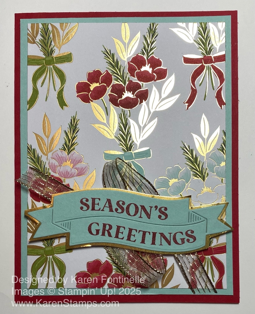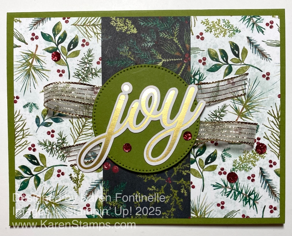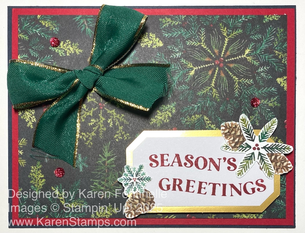 This kind of card is difficult to photograph with its gold foil accents, but I assure you this Traditions of Christmas Season’s Greetings Card is pretty in person! This is the particular patterned paper that “spoke” to me when I looked in the Tradtions of Christmas Specialty Designer Series Paper. That’s a good way to get your creativity going – just look at a package of designer series paper and see what strikes you! Then go from there!