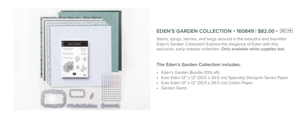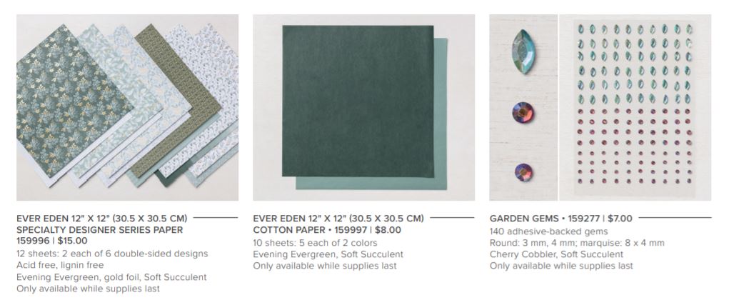 Exclusive specialty Designer Series Paper; available only during the Eden’s Garden promotion. $15.00 12 sheets: 2 each of 6 double-sided designs Evening Evergreen, gold foil, Soft Succulent. Only available while supplies last.