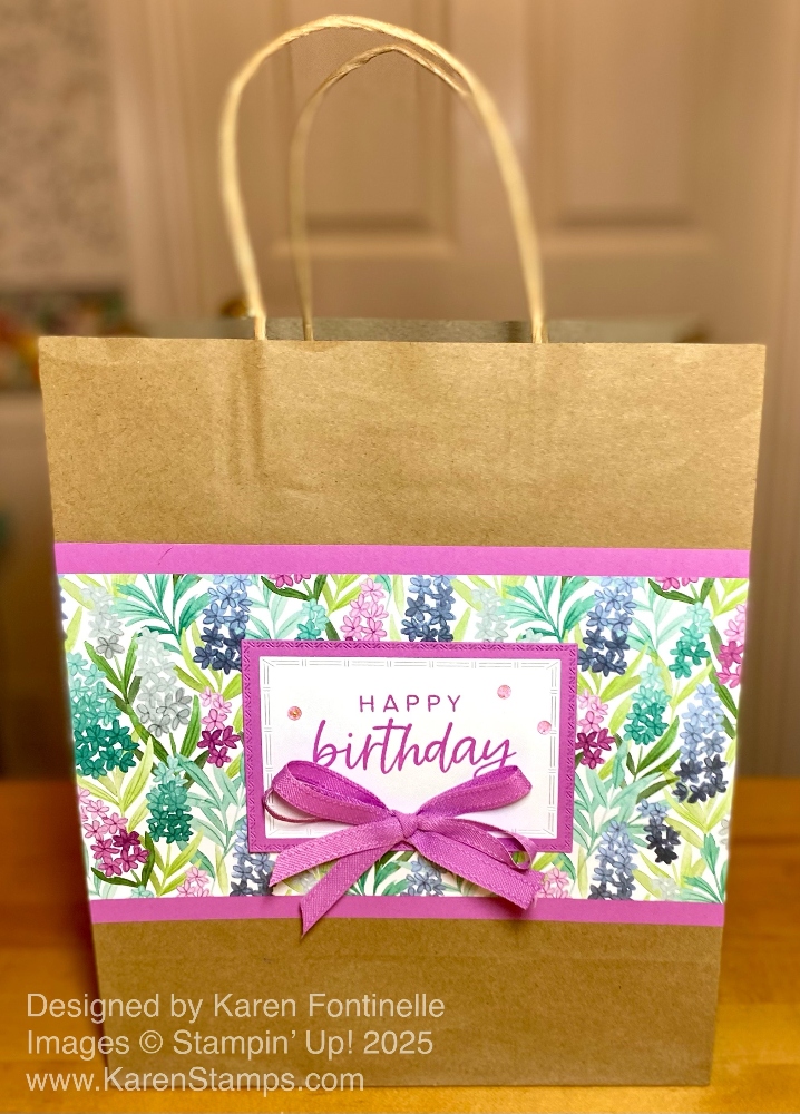 In honor of the new Stampin’ Up! Annual 2025-2026 Catalog that went live yesterday (did you hear??!), I thought I would look through it for an idea for a card and I found it on page 45 of the catalog! This Florals In Bloom All-Occasion Card is what resulted from following the “technique” for this card described on page 45. There couldn’t be an easier idea to try and is a great way to show off both sides of our beautiful designer series paper!