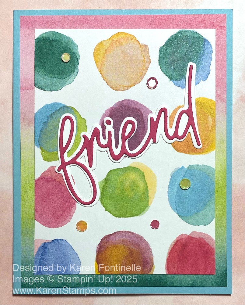 The greeting is stamped in Melon Mambo ink and was just there in my package so I’m not sure which stamp set that greeting is from but you could use whatever suits your occasion when you make the card. For a little sparkle I added a few Purple Adhesive-Backed Sequins that were a free product to earn during Sale-A-Bration 2025. You can use any sequins or gems, of course.