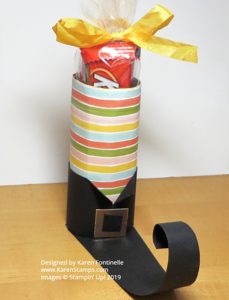 The Witch’s Boot is easy to make. Just grab an empty toilet paper roll or cut down a paper towel roll or whatever roll you have. Wrap some designer paper around that you think looks like a sock. Then make a boot collar for the base. It just wraps around and meets in the middle. Then fold back the corners. The only thing to watch for is to make it wide enough so you can add a buckle. Then add a long strip for the base of the boot that is only as wide as the toilet paper roll. Narrow it down diagonally on each side and curl the tip if you like. No measurements, you can just do it for your size roll.