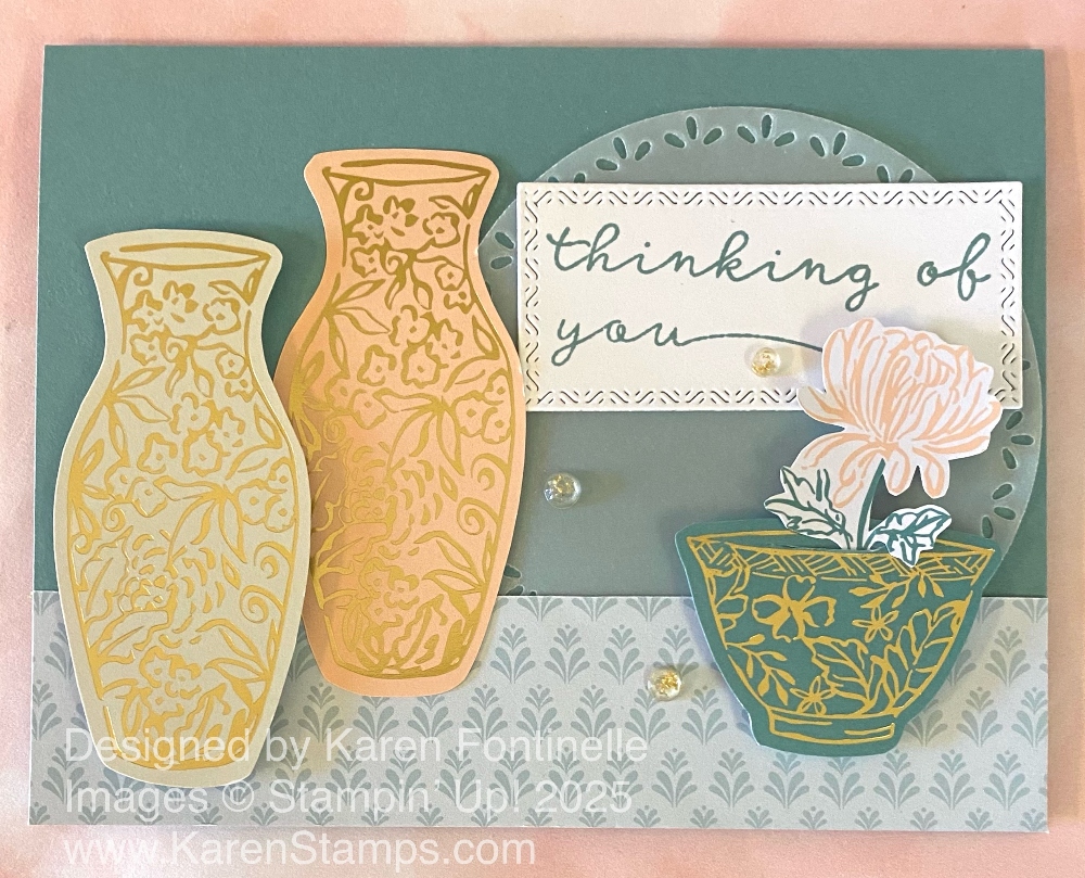 All you need are dies or scissors to cut out these beautiful images for this Kintsugi Inspirations Vases Thinking of You Card. And they are easy to cut out if you don’t have the dies!