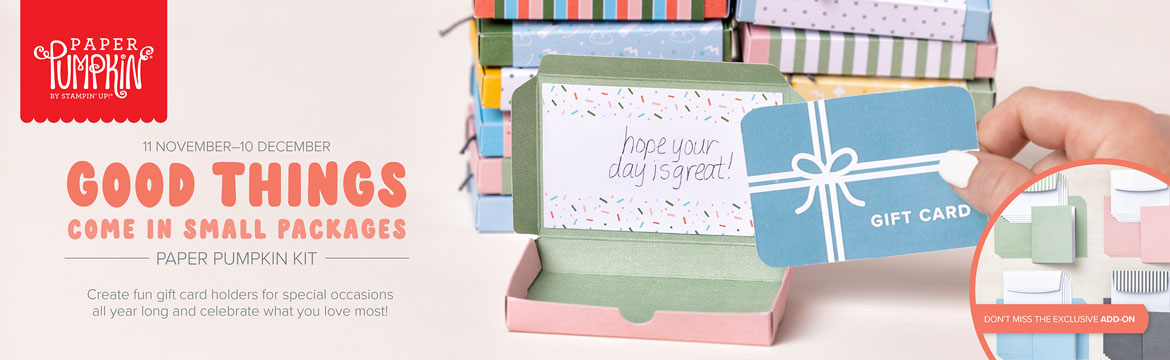 I always say this is a gift you give yourself! Be surprised each month when the Paper Pumpkin Kit shows up in your mailbox and it’s just for you! No supplies needed, no designing by you needed…just sit down and craft! It’s all in the box! You can order extras too if you want to invite a friend or relative over to craft with you!