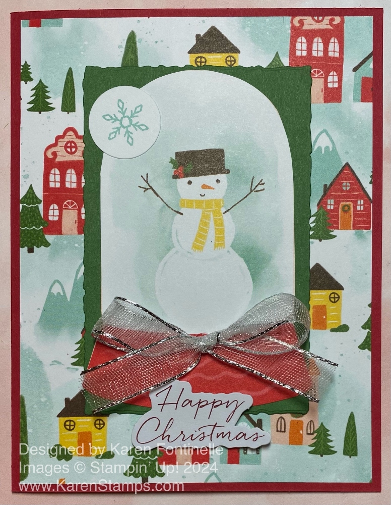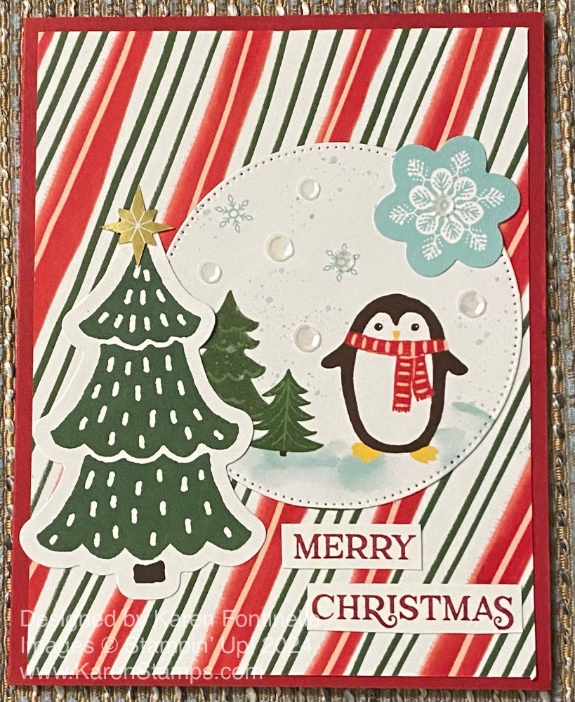 The card base is Real Red cardstock. The diagonally striped paper as a layer on the card is in the Snowy Scenes 12″ x 12″ Designer Series Paper. This paper has such cute images of snowglobes, penguins, snowmen, villages, and more! Have you noticed how much “pink” is out there this season in Christmas decorations? Some of these papers use that pastel peach and mint color scheme that seems to be in style these days. Even if you are a traditionalist with red and green, you will find plenty of those colors mixed in with some of the pastel colors.
