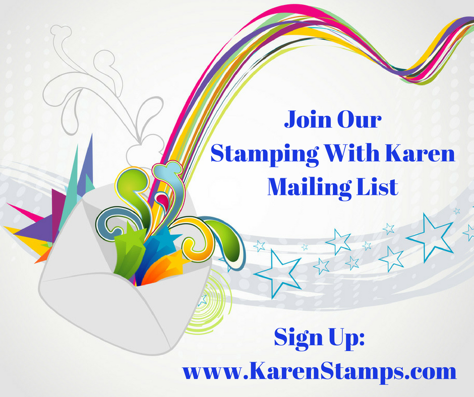 Have you signed up for my Stamping With Karen Mailing List yet? If you like visiting my blog or if this is your first time here, please join us by signing up in the Mailing List Sign Up Box! You will receive an email newsletter on the first Tuesday of each month with the latest Stampin’ Up! news and any special offers, plus at least one tutorial for a card or another project or tip. Each following Tuesday I send an email, again with some kind of stamping idea or review some projects I have recently had on my blog, plus any news or reminders. Stampin’ Up! generally updates us on Tuesday mornings so that is why Tuesday is a good time to get in touch with you!