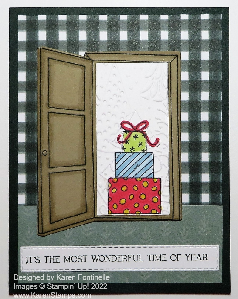 The blue piece at the bottom of the card is meant to look like a carpet inside the house. It’s one of the patterns in the 2022-2024 In Color 6″ x 6″ Designer Series Paper. I just cut a 1 3/4″ strip of it. Perhaps I should have glued the door right at the top edge of the carpet!