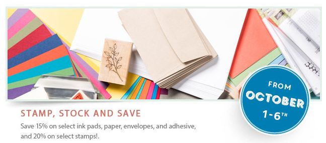 Today and this weekend it’s time to take inventory of your stamping card stock and ink! See what you are low on or want to stock up on because Stampin’ Up! has a sale – but only until Monday, Oct. 6! Be sure to take a look at the Stamp, Stock & Save Sale going on now for just a few days! Save 15% on individual ink pads, assorted card stock families and Whisper White, Medium envelopes, and Fast Fuse Adhesive. Save 20% on a few great stamp sets!