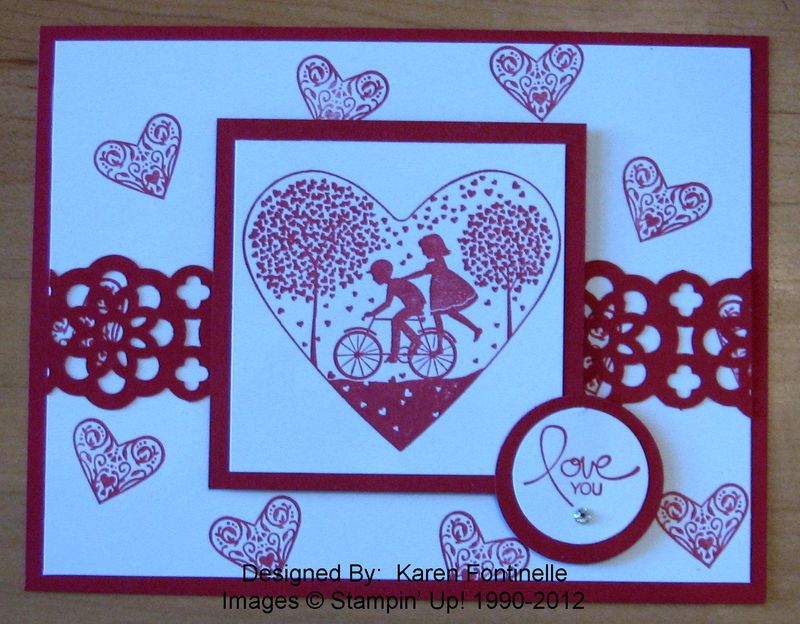 This Valentine card is made with the new stamp set Take It to Heart in the Occasions Mini Catalog and is the swap card I made for the Stampin' Up! Leadership Conference last week in San Antonio. The color is a bit off but it is Whisper White and Real Red card stock. Just some stamping and some punching with the Large Lace Ribbon Border Punch #122362 and a little blink with a small rhinestone jewel.