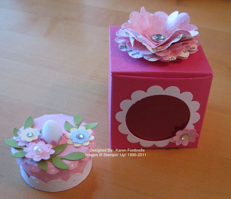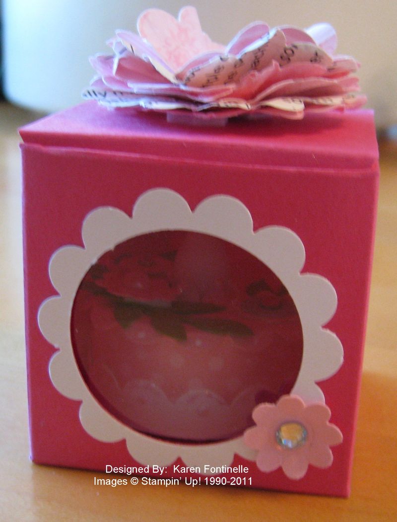 Thanks for visiting my blog! I have sent you an email with photos, but basically I think the box is called a “2-4-6-8″ box because that is how you score your paper. Start with a 8 1/2″ x 6 1/2″ paper. Score on the long side 2″, 4″, 6″ and 8″. Turn the paper the other way and score at 2″, 4″, and 6”. You will use a 1 3/8″ Circle Punch for the window in the side of the box. Once you know how to make a basic box, you can probably adjust it for any size you need.