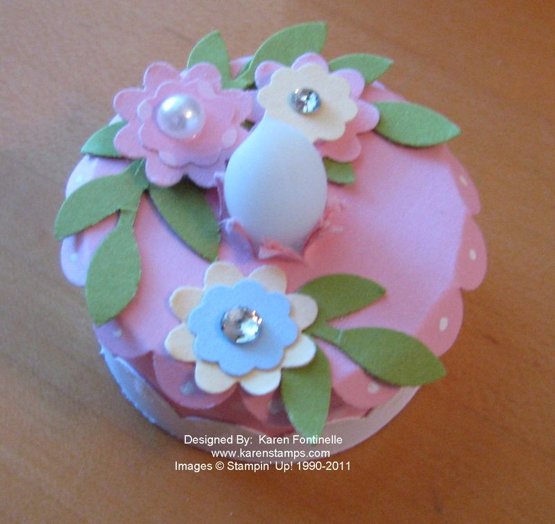 For the flowers and leaves, I used the Itty Bitty Shapes Punch, the Boho Blossom Punch and the Bird Builder Punch.  Then I added some rhinestones and pearls to the flowers.  Put a little Scallop Border on the side of the cake if you want.  I added some Dazzling Details, the new irridescent glitter glue in the Holiday Mini to the scallop border.