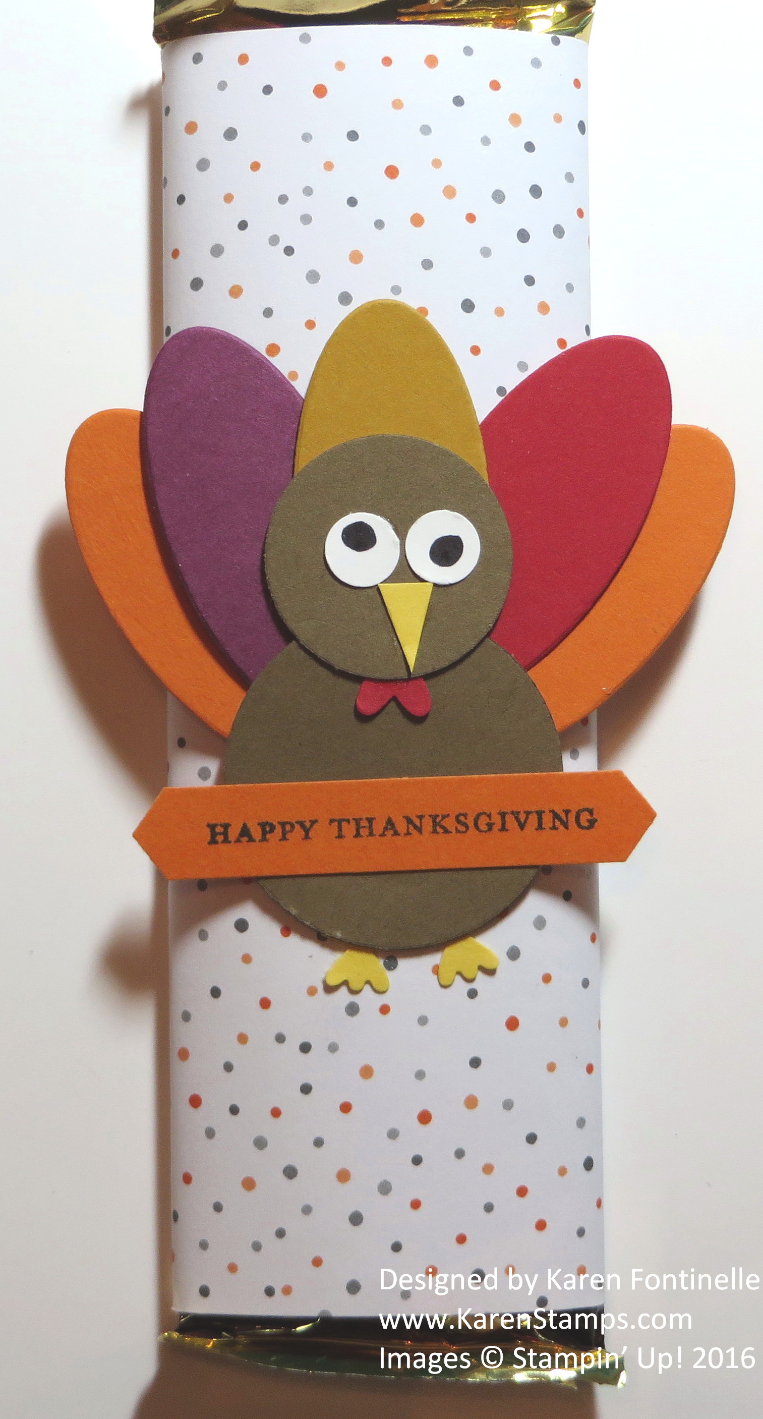 To make the punch art turkey to fit on the candy bar, I used the 1 3/8″ Circle Punch for the body and the 1″ Circle Punch for the turkey head. The feathers were cut out with the Layering Ovals Framelits Dies and Big Shot, but you could also use an oval punch. The turkey feet are punched with the feet of the Owl Punch! What would we do without the Owl Punch?! The eyes are also punched with the Owl Punch but I just colored in the pupil with a black marker. The red waddle on the turkey is the little heart from the …..Owl Punch! Just cut the beak freehand.