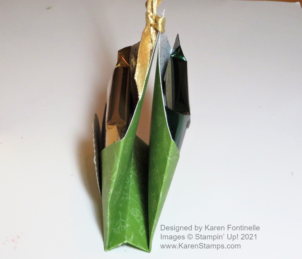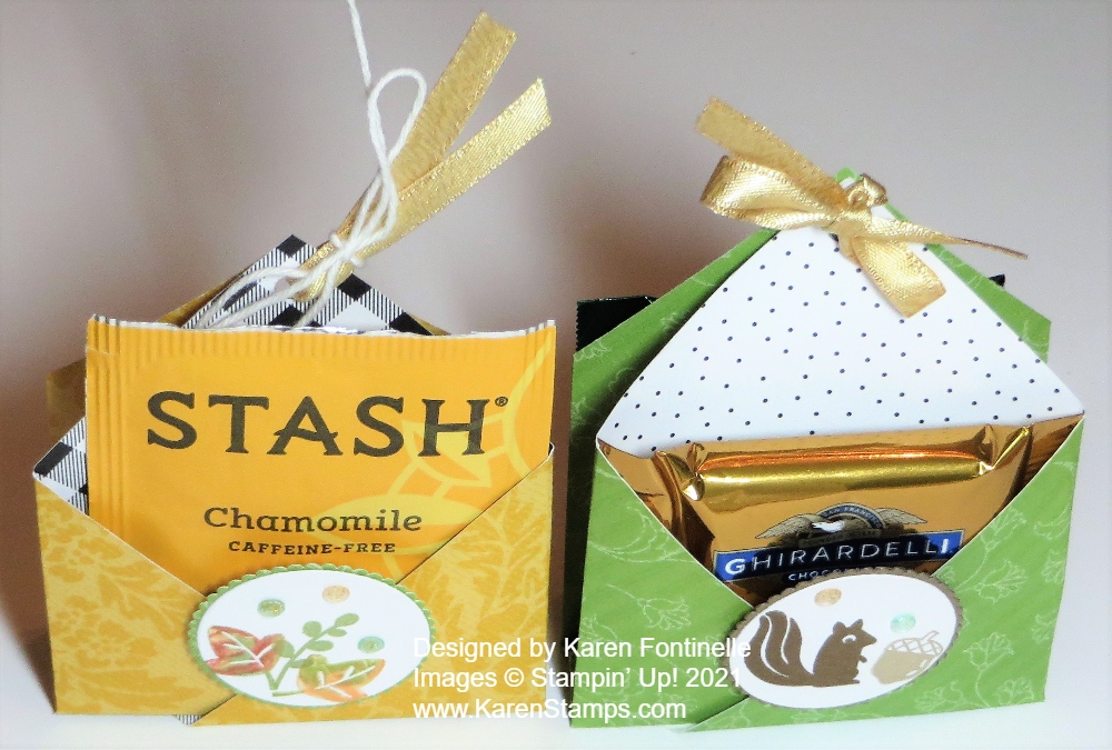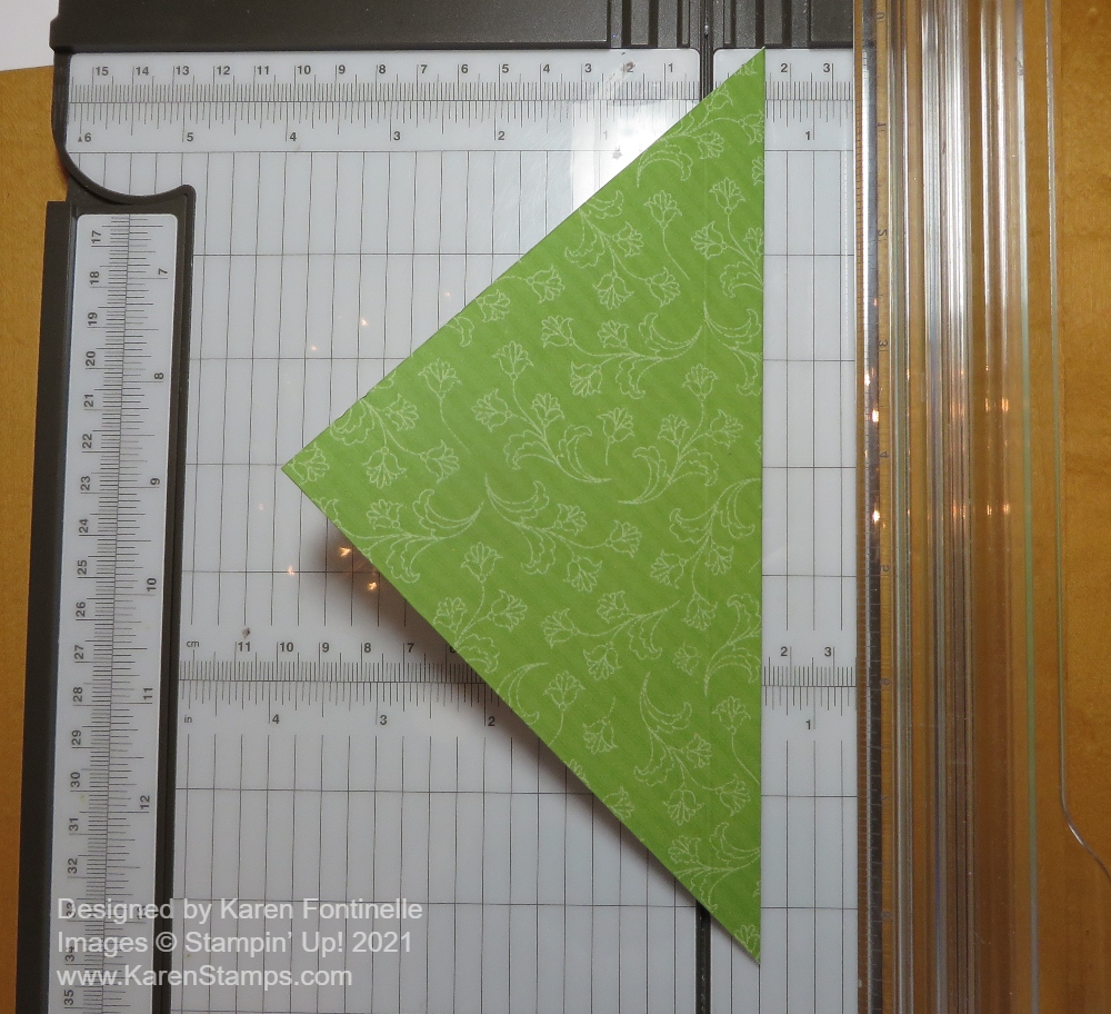 The pumpkins and gourds are stamped with the Pick of the Patch Stamp Set in various colors. You can use any colors that you like and even “stamp off” if you want a lighter shade. I used Pumpkin Pie, Daffodil Delight, and Granny Apple Green. There is a Pick of the Patch Builder Punch that you might like for pumpkins. I don’t have it so I just cut out my images by hand with my Paper Snips.