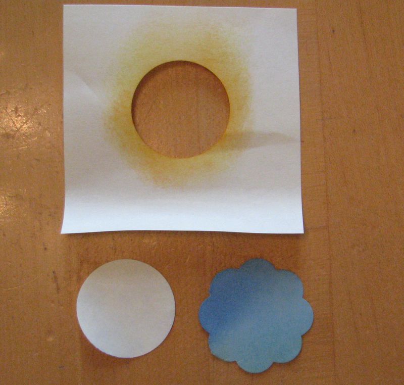 In the photo below, you can see the post-it note I punched in order to get a stencil for the sun in order to sponge in the Daffodil Delight yellow ink and also a touch of Pumpkin Pie for the orange. Then I used the punched out circle as a mask, placed over the sun so I wouldn't get ink on it as I made the sky. The sky is made with a punch from the new Blossom Bouquet Triple Layer Punch #122464 in the Summer Mini. I then just sponged some blue ink off the top edges of that punched out piece to make the clouds. Love that technique! Click on the photo of the card to enlarge.