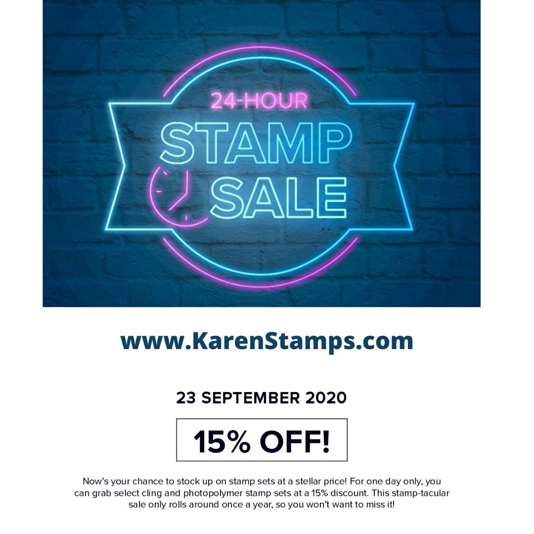 For 24 hours on Wednesday, September 23, 2020—from 12:00 AM to 11:50 PM (MT) online — a select number of cling and photopolymer stamp sets from the 2020–2021 Annual Catalog will be available for purchase at a 15% discount!