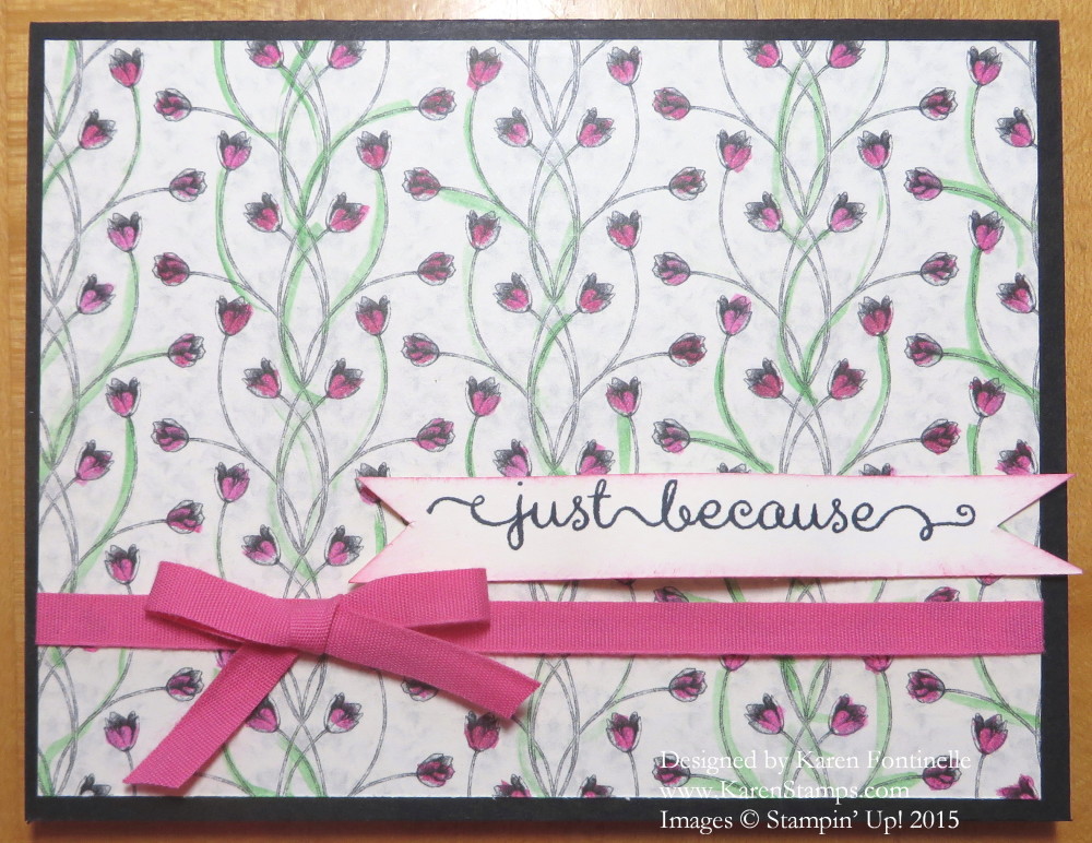 On this card, I loved the tiny flower pattern and decided to try coloring in the little flowers with my Aqua Painter and some Melon Mambo ink. I didn’t try to carefully color in each little flower, I didn’t even have my reading glasses on! Watercoloring does not have to be exact so I just put down some color inside each little flower. Then I added a few Cucumber Crush green stems here and there, you can see I didn’t do every little line and I didn’t worry if they were exact either. I just had fun!