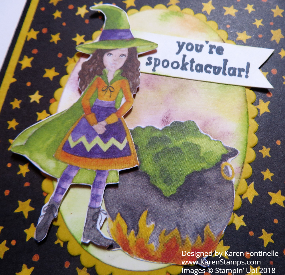 Since Halloween is right around the corner (ha!), here is a card I made to get us in the mood! I love all things cute an lovely for fall and Halloween and I think this new Toil & Trouble Designer Series Paper in the upcoming Holiday Catalog fills that bill! You’ll find cute witches and cauldrons, like the ones on this card, plus little spiders, bats, lovely pumpkins, and even some generic paper patterns that you can use for backgrounds or trim on Halloween cards or even on other cards.