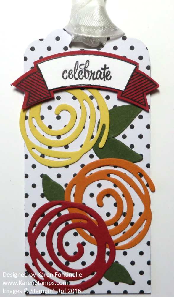 Here is a quick and easy project to make a Pop of Pink Swirly Scribbles Polka Dot Scalloped Tag. I simply punched a tag with the Scalloped Tag Topper Punch out of the polka dot pattern of one of the papers in the Pop of Pink Specialty Designer Series Paper. I first was going to use some other die cut flowers, but then I thought it might be fun to see how the Swirly Scribbles die cuts might work. I chose three colors in the Brights family: Real Red, Pumpkin Pie and Daffodil Delight. I also die cut some green leaves.
