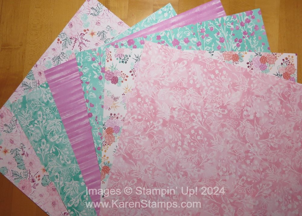 The thing we always say about Stampin’ Up! designer series paper…It is SO much prettier in person than you think looking at the photos online! I wasn’t too thrilled looking at the online photo of this paper, Unbounded Beauty Designer Series Paper, but once I opened the package I thought it was really beautiful paper! You’ll like it! Very pretty colors!