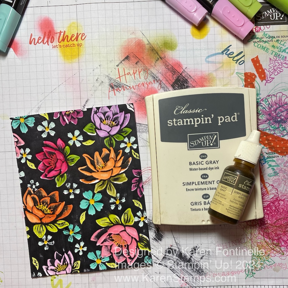 You can use a Memento ink pad or a Stampin’ Up! ink pad. I used Basic Gray which is dark and looks like black. Don’t swipe the ink pad completely flat on the card but rather hold the edge of the pad at a slight angle as you swipe over the card. You do need a juicy ink pad as this uses a lot of ink! You probably will need to go over it in several swipes to get every area covered in the dark ink. You might use a tissue to hold the cardstock down so you don’t get ink all over your fingers, but it is a messy technique!