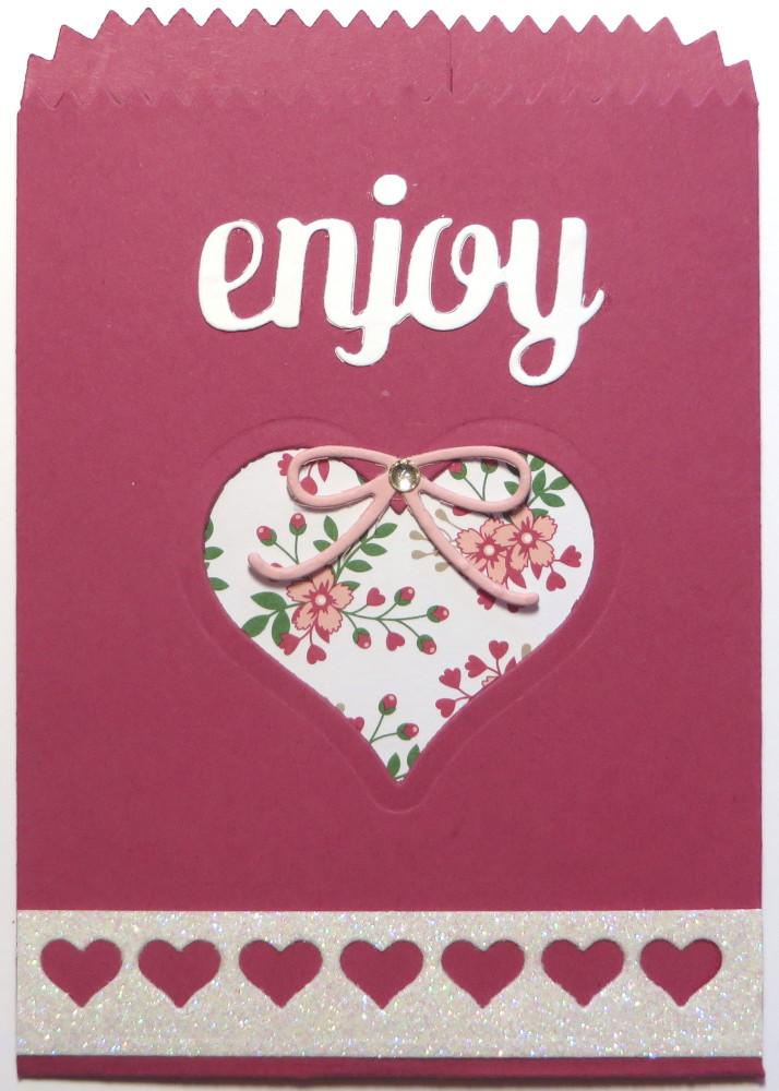 Next just decorate your treat bag with any embellishments or die cut some of the pieces that came in your set for whatever occasion you are making this for! This bag I made could be for Valentine’s Day but doesn’t have to be. Make a separate card to slip inside and have the whole thing be a card rather than a bag. Fold over the top and make a bellyband to make it an enclosure. Just have fun with it and you will!!
