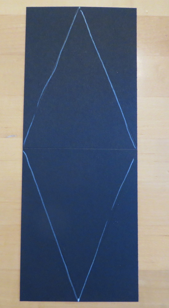 Here’s another Halloween Treat Box for you. These triangle boxes are SO easy to make. Just cut some card stock 4 1/4 x 8 1/2″. Then find the middle of the top and bottom and mark it. Place in your Paper Trimmer and score in half at 5 1/2″. Then score from the middle mark top and bottom on both sides to that 5 1/2″ score line. Check the diagram below. Then crease the lines and fold up. Punch holes through the top point and after putting treats inside, tie shut with ribbon. I decorated this to look like a hat with some designer paper and a hat brim piece. The decoration is a leftover piece from my Paper Pumpkin Kit.