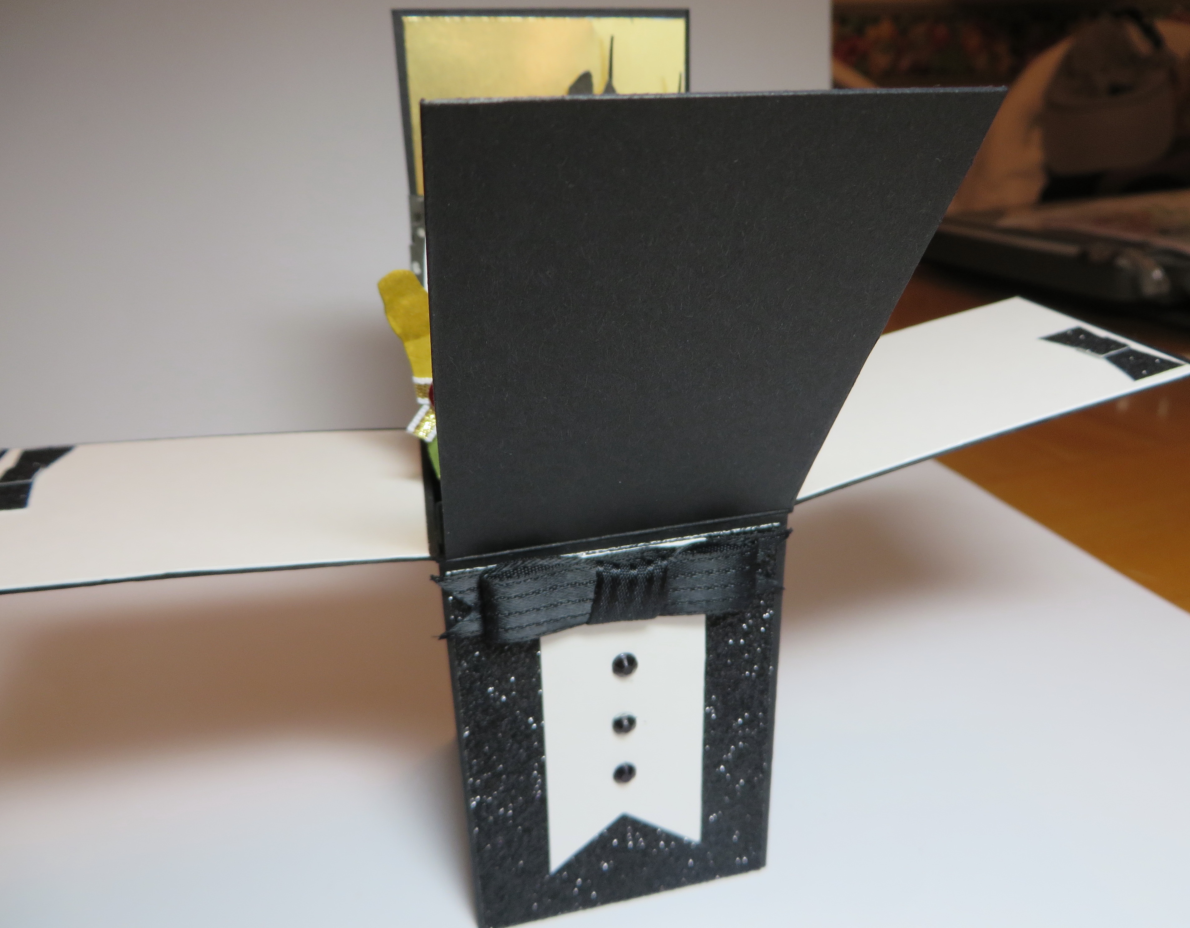 These pop up cards that fold flat and fit in an envelope for mailing are relatively easy to create and can then be customized for any occasion, such as this tuxedo card for a special gentleman’s birthday. This was a custom order for someone who knew exactly what she wanted and really designed the card, I just had to make it come to life.
