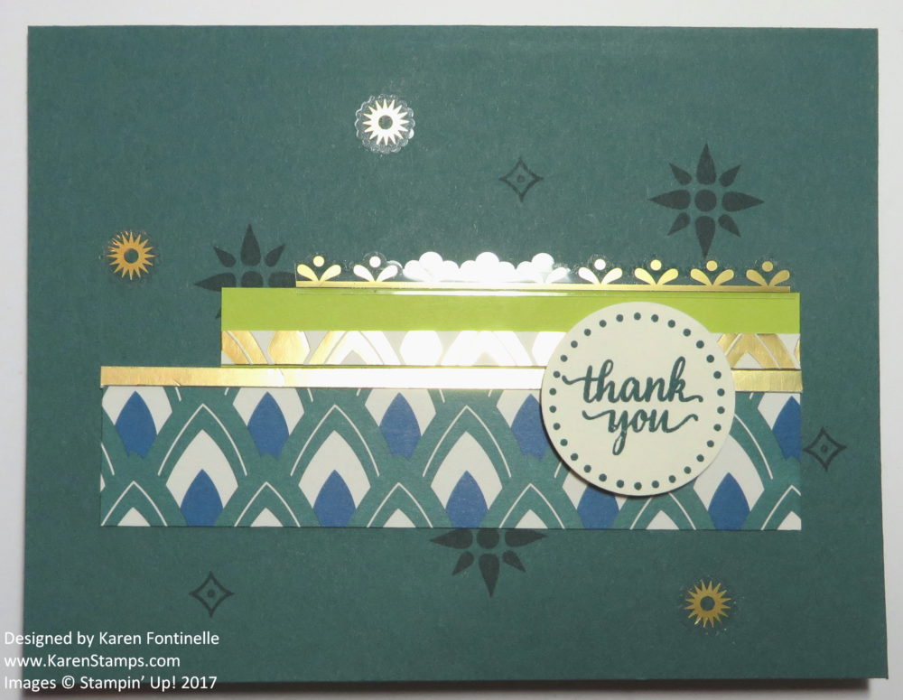 Different from the Stampin’ Up! catalog sample, I found the urge to use the fun Eastern Gold Vinyl Stickers too strong to resist! The sample card used a piece of the new Gold Mini Sequin Trim, but since I don’t have that yet, I felt the card needed a little more pizzazz, which I had already tried to add with the gold foil pieces of paper. Since we have the gold stickers, I looked in there and chose some to use on the card. The stickers are high quality, easy to use, and fun to use!